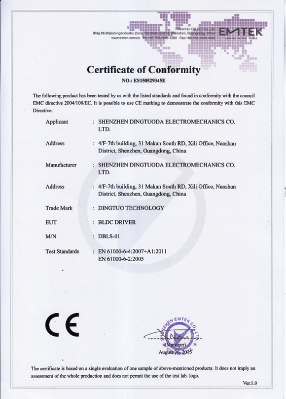 首頁->產品認證->無刷驅動器CE認證證書